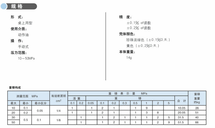 可用于高壓領域(10-50MPa)的壓力范圍檢查和校正