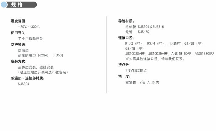 感溫元件和開關部分構成.感溫元件內部充滿了液體,通過液體的膨脹和收縮引起開關動作。本產品可根據現場環境選擇對應的填充液和殼體構造。
